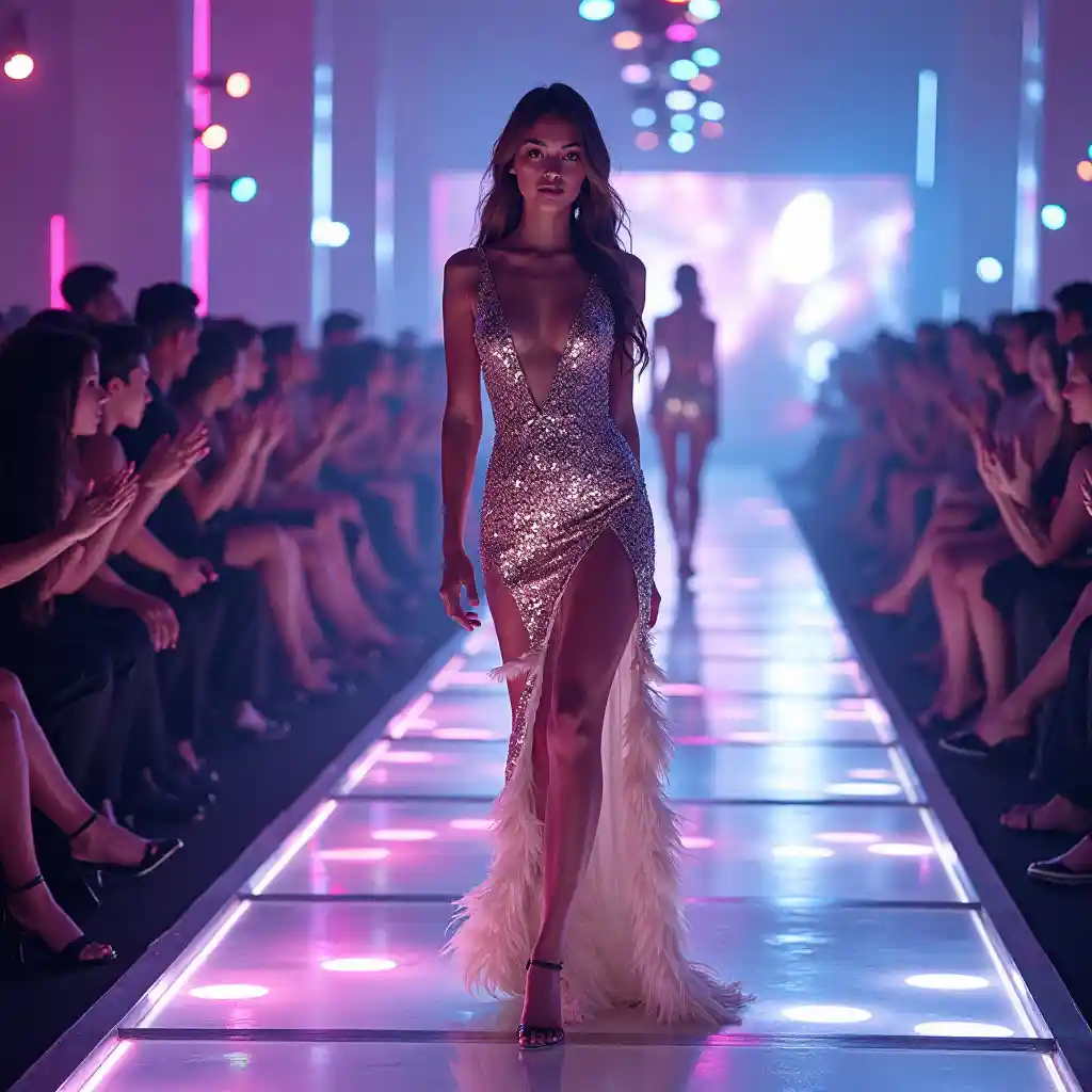 Eine weiße Frau Mitte 20 posiert auf einem Laufsteg unter Neonlicht und glänzt in einem hochgeschlitzten Paillettenkleid mit Federakzent. Die holografische Laufbahn und die jubelnde Menge rahmten sie ein, ihre langen Beine und ihr tief hängender Ausschnitt versprühen in einer futuristischen, faszinierenden Szene den Charme der High-End-Mode und die selbstbewusste Sinnlichkeit.