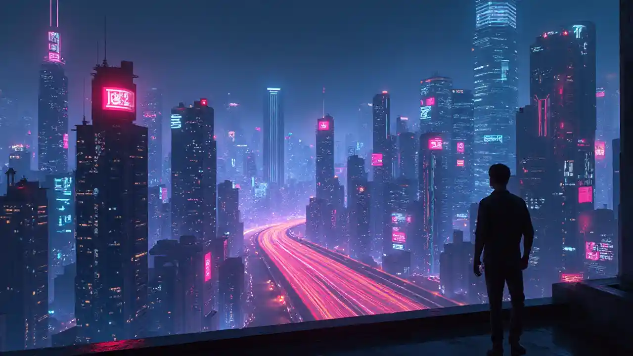 Beleuchtung der Cyberpunk-Skyline: Dachperspektive