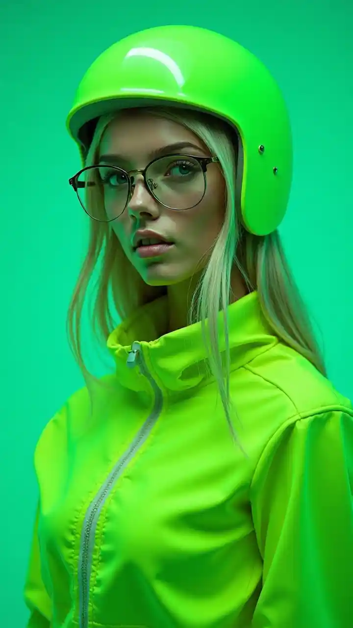 Ein 24-jähriges weibliches Supermodel mit neongrünem Helm, Trainingsanzug, Brille, Stil mit sehr futuristischem Charme, Retro-Futurismus, neongrünem Outfit, Brille farblos, transparentes Glas, lange goldene Haare, blondes Mädchen, blaugrüner Hintergrund, Mike campau, Anton fadeev, Highlight, mono-ha