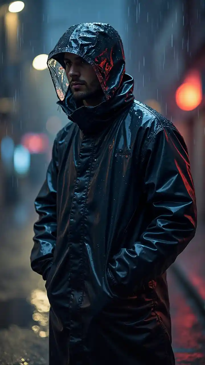 Ein Mann in schwarzer, durchsichtiger Regenjacke, Regen, Ultra-Reality, Neon