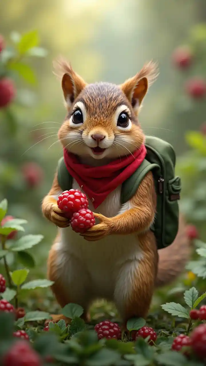 Ein realistisches Bild einer fliegenden Ratte mit rotem Ninja-Schal und grüner Essenslieferung, die Himbeeren aus einem Gebüsch pflückt und in einen Rucksack steckt.