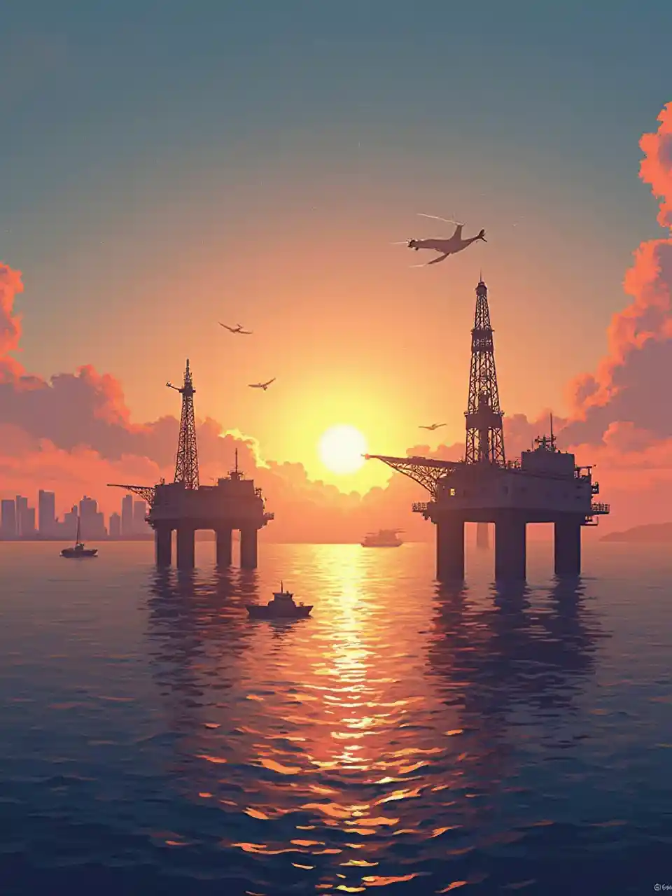 AlexanderDigitale Malerei von Offshore-Bohrinseln und -Schiffen im Golf bei Sonnenuntergang, Skyline der Stadt und schematische Elemente der Luft.
