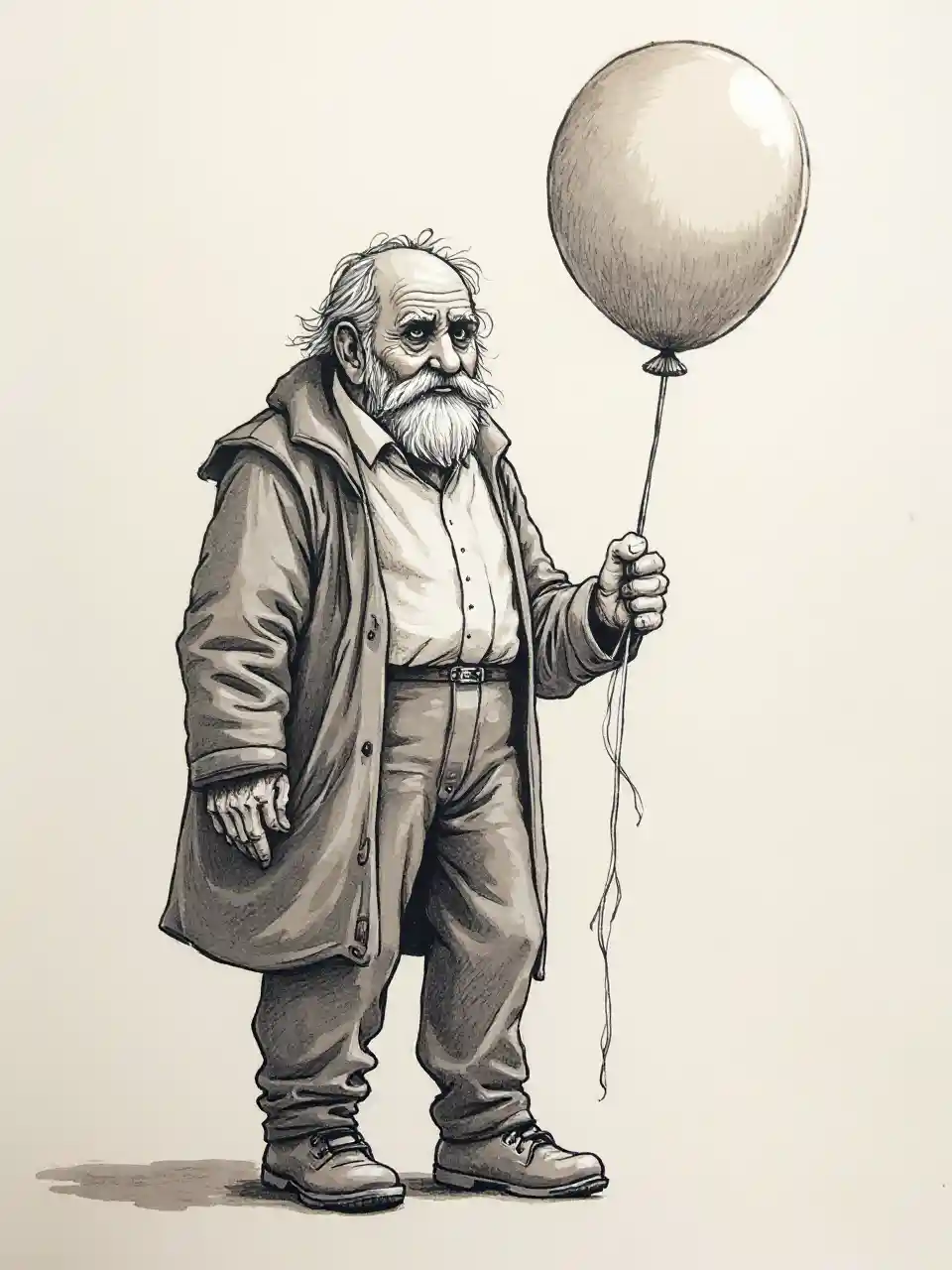 Tintenstift-Skizze, Schimmer, Detailtiefe, der alte Mann hält Luftballons in der Hand