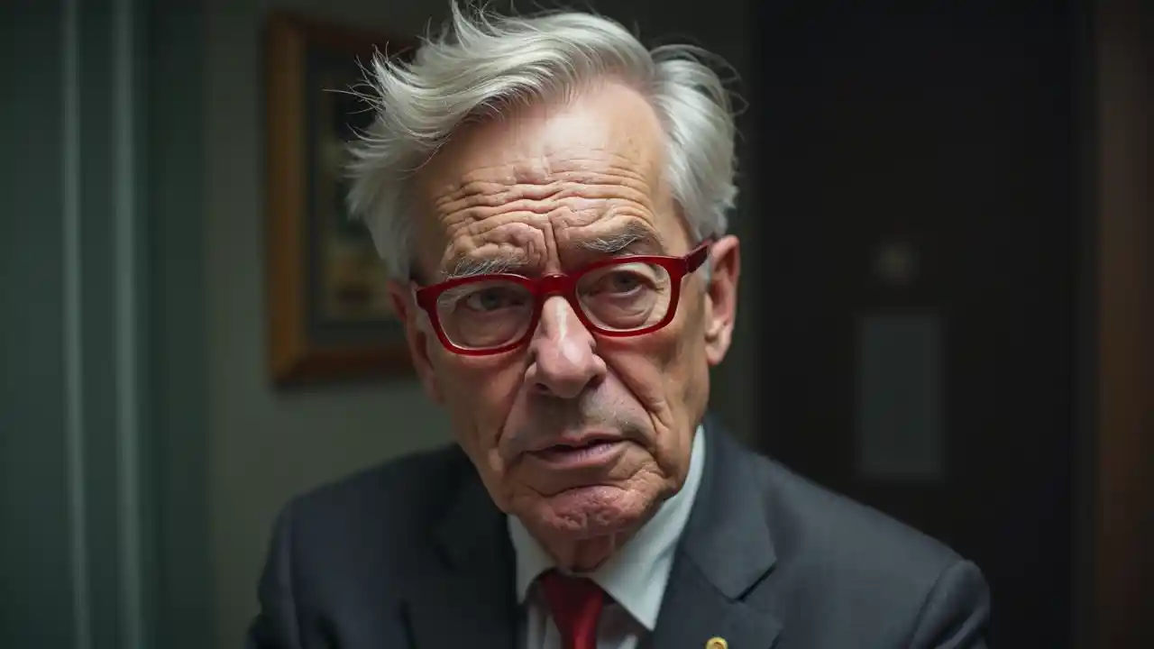JacobAlter Kerl, silberne Haare, rote Brille, Anzug, seitliche Haare