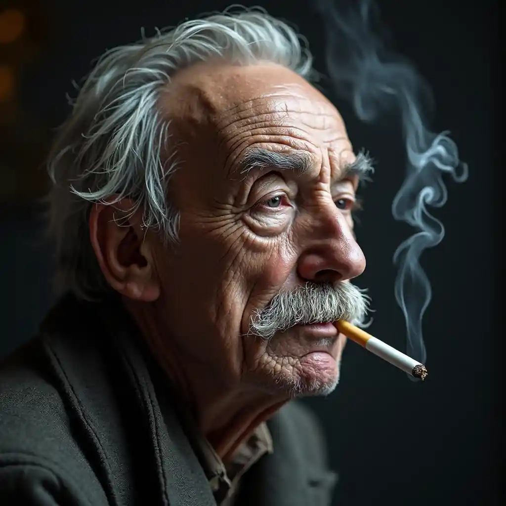 MwangFaltenreicher alter Mann mit grauem Oberlippenbart raucht Zigarette und schaut nach rechts