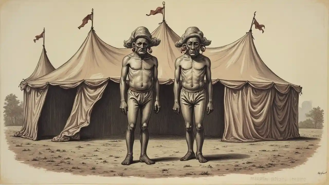 Alte Drucke von Hendrick Goltzius, Postkartenillustrationen, Ganzkörperporträts, sehr alte und traurige siamesische Zwillinge, allein vor Zirkuszelten
