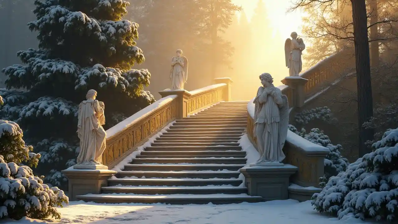 AidenEine Palasttreppe, neben einer schneebedeckten Tanne, Statue mit Engeln von Puto, Nebel, goldenem Sonnenschein
