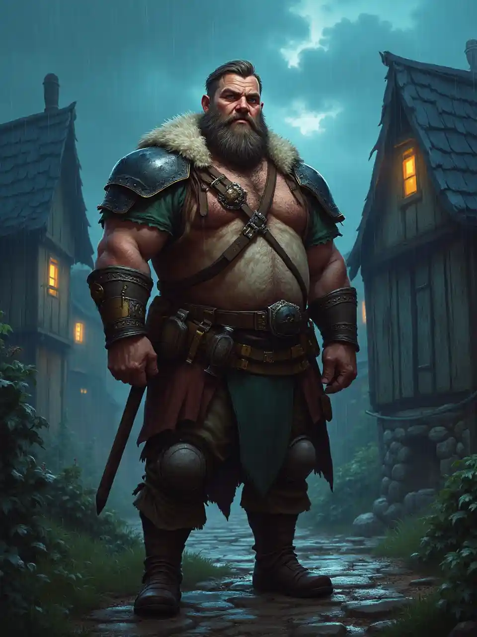 Männlich dick, muskulös, dick, alter Paladin mit kurzen Haaren und flauschigen Brusthaaren, kleine Fantasie im nächtlichen Regen Außerhalb des Dorfes, Pathfinder, d & d Kulisse, in einem realistischen, hochwertigen digitalen Kunststil, verbesserte Bildqualität, farbenfroh