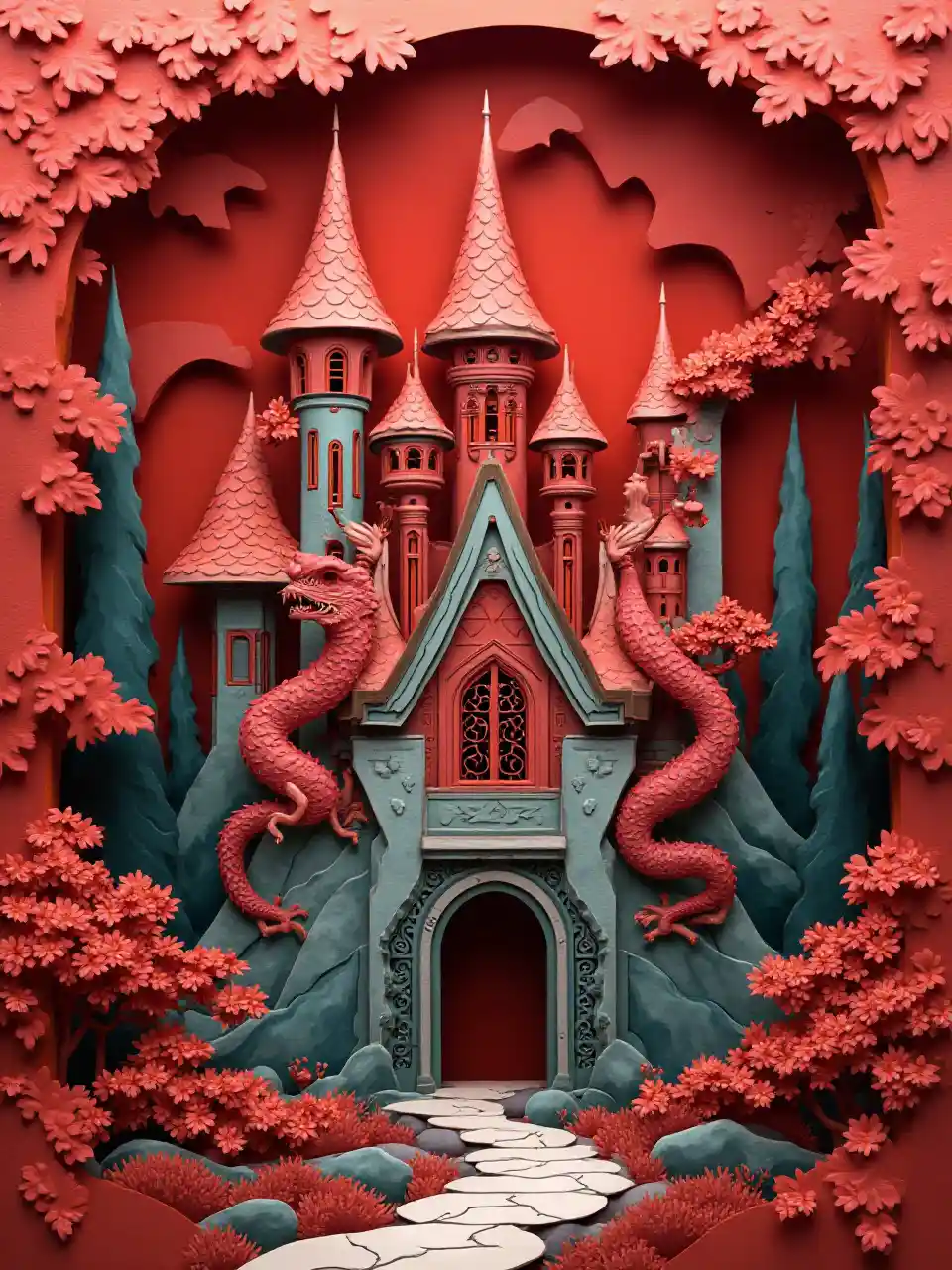 Scherenschnitt-Handwerk, Papiereinlage, Burg, rote Umgebung, Wände und Kronleuchter, Weinstöcke, wunderschön, super tödlich, 8k detailliert