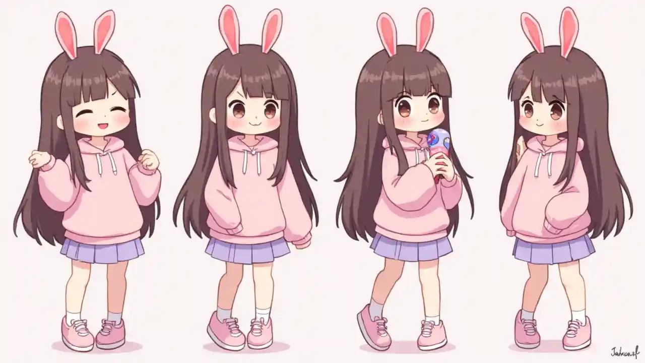 FNF Elfenbettlaken → ein Mädchen → eine niedliche, weiche Cutecore-Figur im Funkin-Stil am Freitagabend, dunkelbraune lange Haare fast bis zum Hintern, weiche Pony skizziert das Gesicht. Er trägt einen überdimensionierten, blassrosa Kapuzenpullover mit Hasenohren an der Kapuze und einen knielangen, fadenlilafarbenen Faltenrock. Pastellfarbener Lavendel-Sneaker mit dicken Sohlen, niedlicher tierischer Charme. Mit einem Pastellmikrofon, das mit einem winzigen Tierfluch verziert ist. Ein weicher, leicht lächelnder Ausdruck. Da die Ärmel zu groß sind, werden die Arme gelockert und über den oberen Oberschenkel abgesprungen. Große ausdrucksstarke Augen, die in sanftem Licht schimmern. Die insgesamt zarte und warme Farbpalette mit dezentem Hochglanz im Haar zeigt einen schwarzen Unterton. " "Freie Haltung, ein leichtes Lächeln, sanft das Mikrofon in der Hand. Eine weiche und entspannte Haltung, in der die Beine nebeneinander liegen und sich die Füße leicht nach innen drehen. Ein sanftes Augenzwinkern. "