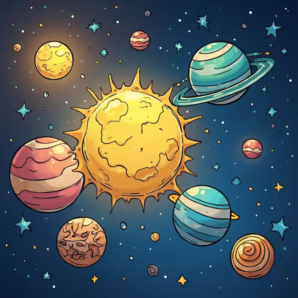 JamesCartoon-Sonnensystem mit Minzplaneten und Zitronentropfenmond