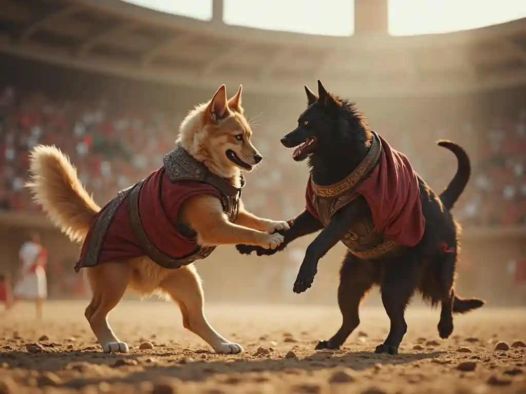 AidenEine Katze und ein Hund, angezogen, kämpfen in der Arena, Gladiator-Style.