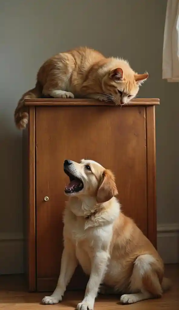 WyattEine Katze rollt sich auf dem Holzschrank zusammen, ein Hund sitzt auf dem Boden des Schranks, zwei Tiere wirken aufgeregt und streiten sich immer noch, 8K, hohe Auflösung, Gewinne