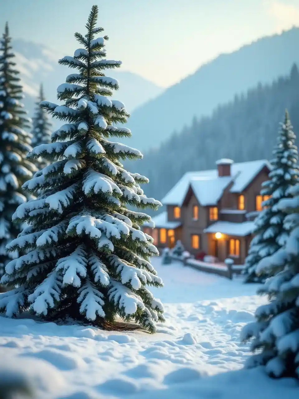 EastonWeihnachtsdorf-Thema Exzenterkiefer und Schneeschicht-Nahaufnahme der Landschaft, helle Farben und Sättigung, Schärfentiefe
