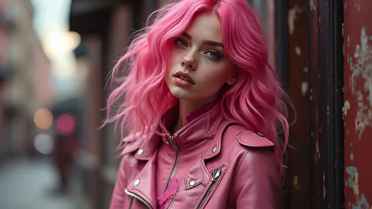 SophiaAmanda Seyfried mit rosa Haaren in rosa Lederleder posiert, im Stil der modischen Metallic-Lackierung, solapunk, Comic-Kunst, firmin baes, auffällig, dunkelweiß und dunkelschwarz, toyen