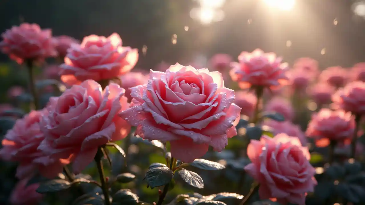 ((Meisterwerk: 1.2), (Beste Qualität, Ultra-Detail, Reality: 1.37) Hochwertige, hochauflösende, Ultra-Detail, unrealistische Engine, preisgekrönte Fotos, Ultra-Reality-Fotografie, 3D, 8k, Kinobeleuchtung, Volumenbeleuchtung, Hartkante Beleuchtung, Ultra-Reality-Fotografie, HDR, Volumen. Viele rosa Rosen stehen in einem Garten und sind von Regentropfen bedeckt. Die Rosen sind in verschiedenen Farbtönen rosa und haben Details in Blütenblättern und Blättern. Die Wassertropfen hängen von Blütenblättern und Stängeln. Durch die Szene strömt Sonnenlicht, das die Rosen hervorhebt und einen weichen, leuchtenden Effekt erzeugt. Im Hintergrund befindet sich ein dunklerer, unscharfer Bereich, der dem Bild Tiefe verleiht. Der Blickwinkel ist leicht nach unten in Richtung Rosen gerichtet und konzentriert sich auf die schöne Landschaft der Blumen und des Regens. Der Gesamtstil malt Romantik und ruft Schönheit und Ruhe hervor. Die Komposition ist ausgewogen und zieht die Augen des Betrachters in die Bildmitte, wo sich die Rosen versammeln. Das Licht ist weich und diffus und sorgt für eine verträumte und bezaubernde Atmosphäre. Mrcajotas Kunstwerke, (Meisterwerke, beste Qualität, Absurdität, Höhe), erstaunliche Qualität, sehr ästhetisch, (Volumenbeleuchtung), digitaler Kunststil, Malästhetik, konzeptionelle Malerei, Ultra HD,