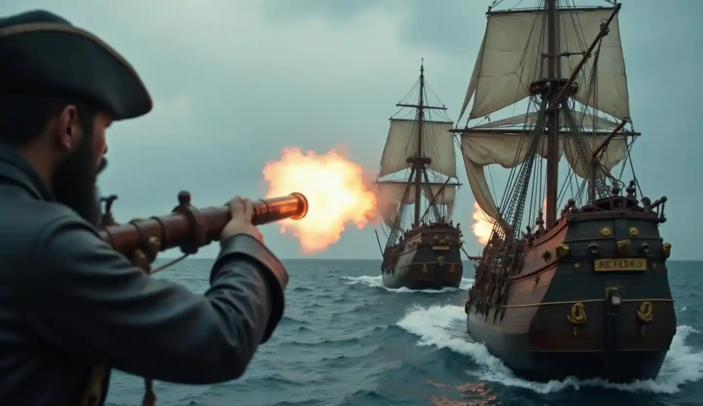 Adalyn(Das Piratenschiff benutzte Artillerie, um britische Schiffe anzugreifen und zu schießen, (HD-Bildqualität, originelle klassische Textur) Filmstil, rauer Seehintergrund E
