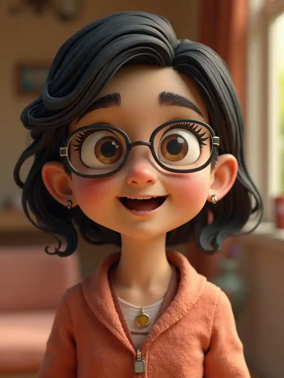 LunaOpa, dunkle Haare, braune Augen, Brille und Halskette, Ganzkörper, stehend in der Mitte, Pixar-Stil, 3D-Stil, Disney Style, 8k, hübsch, Pixar-Stil Mädchen dunkelhaarige braune Augenbrille und Halskette