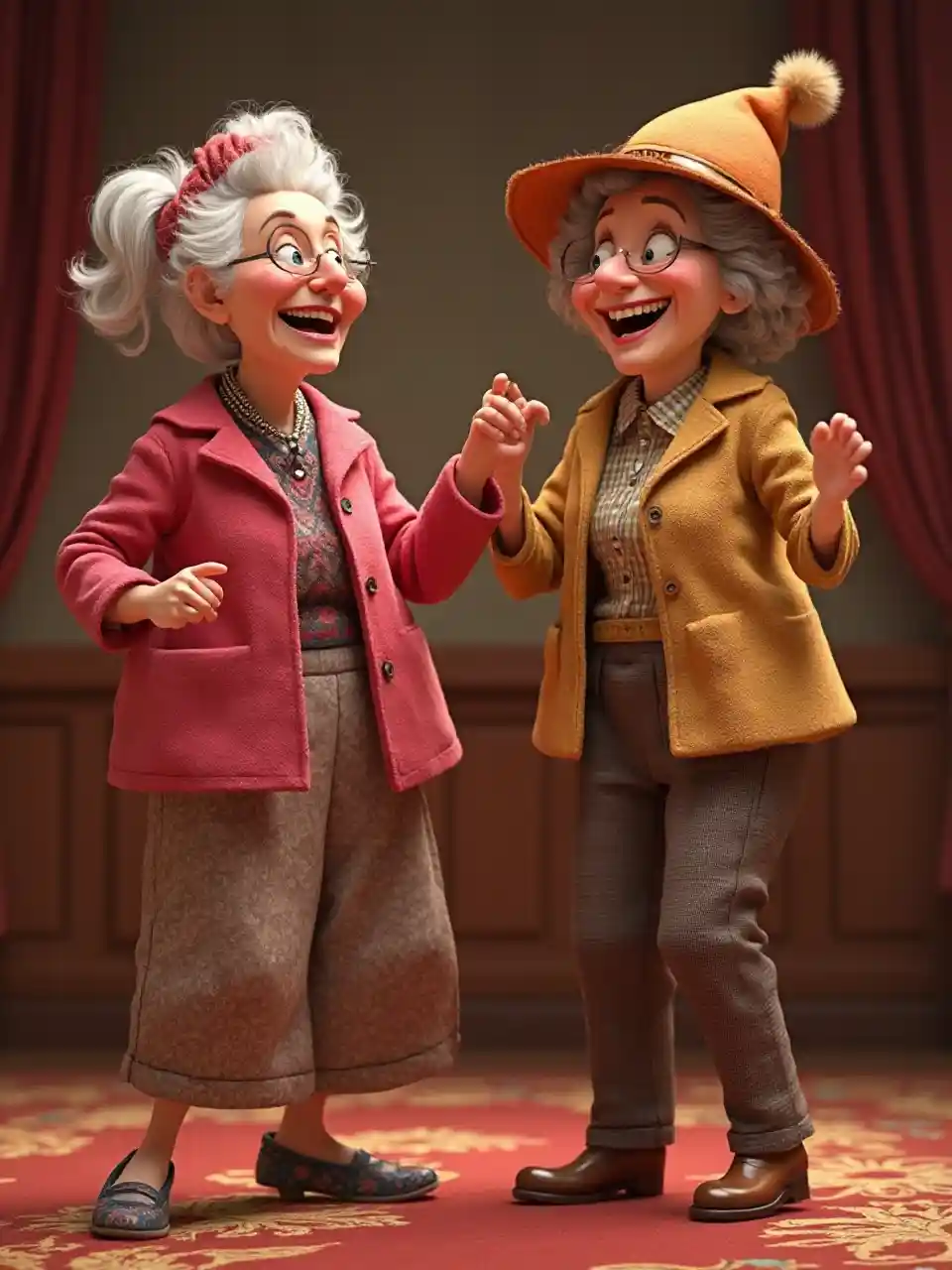 Ganz anders aussehende Haare, lange Blickwinkel, Ganzkörperrauf und -runter, humorvolle Pixar-Filmbilder sind superrealistisch, 3D-Animation, zwei Omas, die ganz anders aussehen, lachen, sie sehen ganz anders aus, große Hüte, tanzen. Vitalität, iris apfel Style