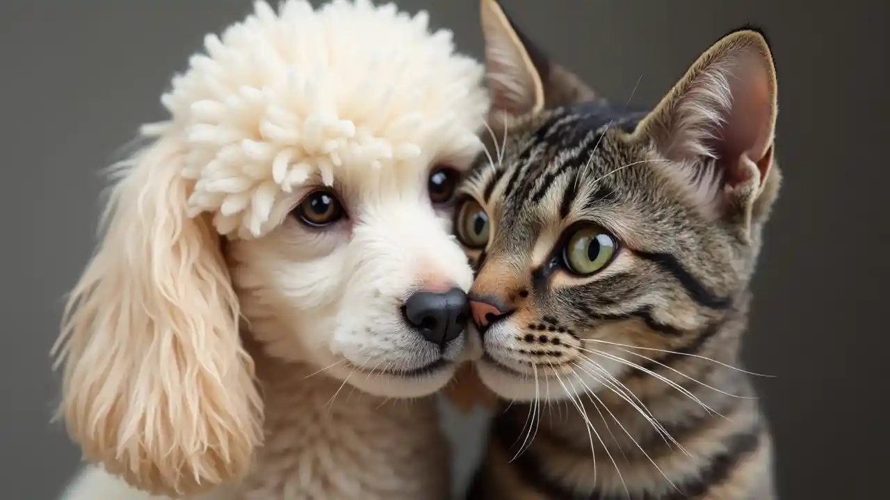 Ein Foto von einem Löwenhund mit halbem Gesicht und einer englischen Kurzhaarkatze, die Gesichter der beiden wurden zusammengedrückt.