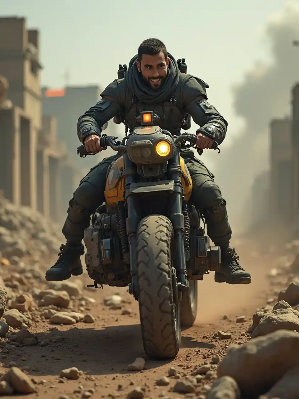 Auf einem Mech durch das postapokalyptische Moor strahlt ein 25-Jähriger aus dem Nahen Osten in einem taktischen Mantel. Die bröckelnden Ruinen und Aschewolken umrahmten ihn, und sein kühner Navigator und sein wildes Lächeln strahlten futuristische Kraft und rebellischen Charme in einer zähen und chaotischen Landschaft aus.