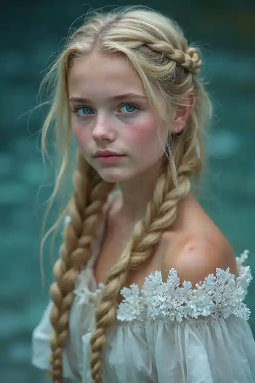 Ein Mädchen kommt aus dem Meer, die Schwanenprinzessin der russischen Mythologie, schönes, ruhiges Gesicht, blaue Augen, lange blonde Haare zu Zöpfen geflochten, der Mond zu Haaren geflochten