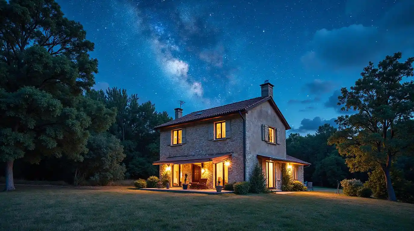 In der sternenklaren Nacht ein Bauernhaus in der Provence in den Farben von Van Gogh.