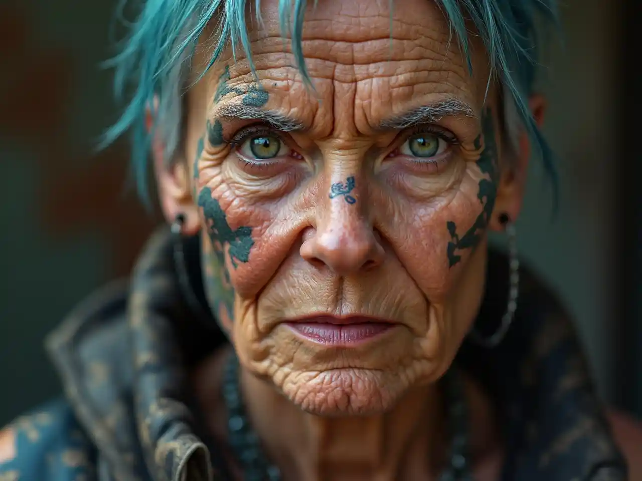 Eine ältere Frau mit Punk-Style, die ihren Charakter durch detailreiche Tattoos, Falten und energiegeladene Porträts in Nahaufnahme zeigt. Ihre Mimik vermittelt Kraft und Intensität, gefilmt in fotorealistischer 8k-Auflösung mit klarer Fokussierung und geringer Schärfentiefe. Die Artistik unterstreicht ihre hochdetailreiche Haut in einem Vollrahmen, die durch diffuse weiche Beleuchtung und filmische Effekte verstärkt wird und den Surrealismus betont. Ihr Äußeres bleibt authentisch, fehlerfrei und sorgt dafür, dass es keine CGI-Fehler, Artefakte oder unrealistische Proportionen gibt. Ohne Text, Wasserzeichen oder irgendwelche Verzerrungen präsentiert sich das Foto in einer optisch ansprechenden und realistischen Darstellung.