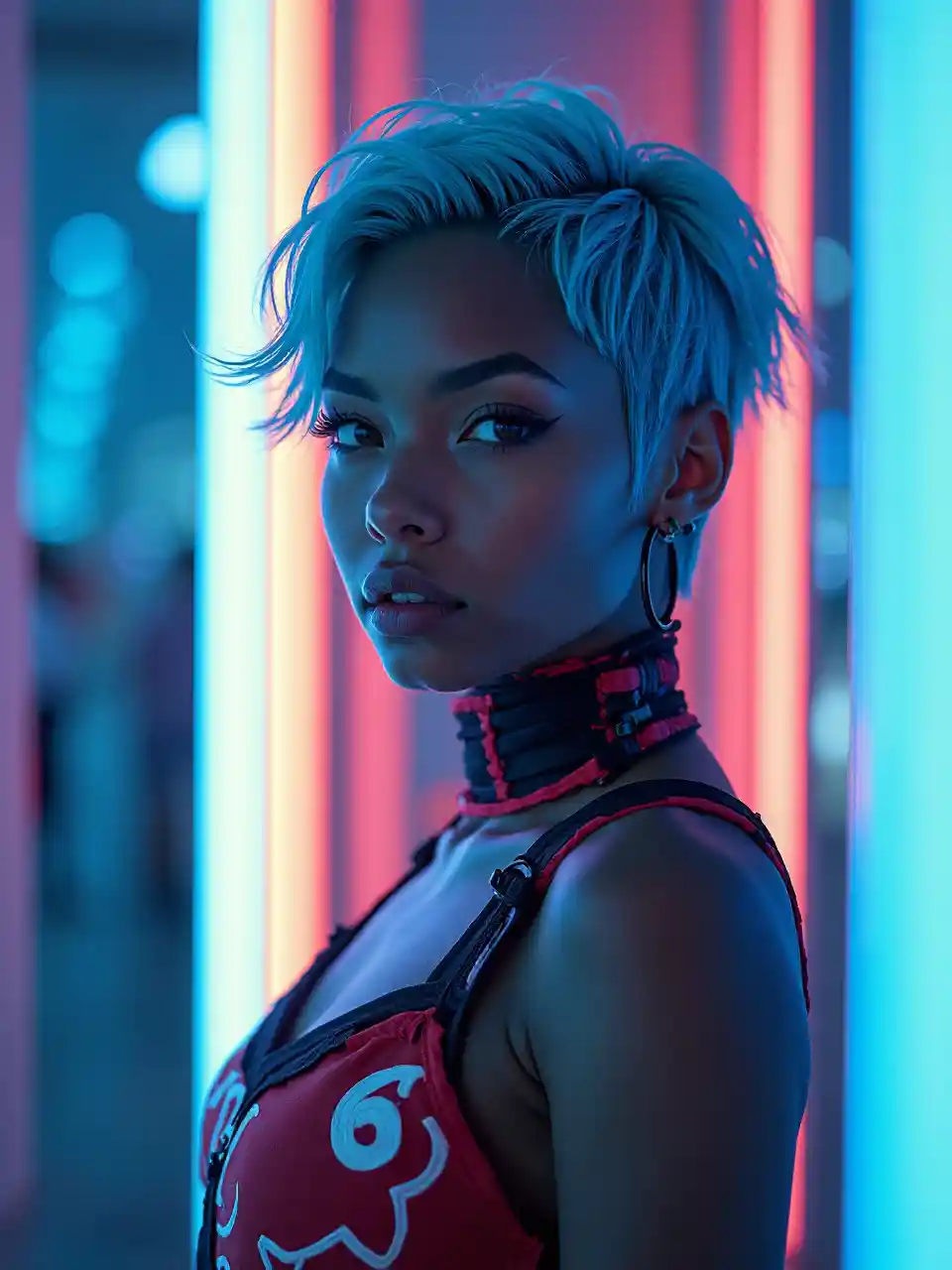 Eine junge, hübsche Punk-Rock-Schwarze Frau mit cyanfarbener Punk-Rock-Frisur, futuristischer Kleidung, Pose vor Neon, stilistisch realistische Super-Detail-Rendering, Weiß und Cyan, gierig, zeitlose Eleganz, evgeni gordiets, Details, die man im Handumdrehen vermisst, weltfremdes Dasein