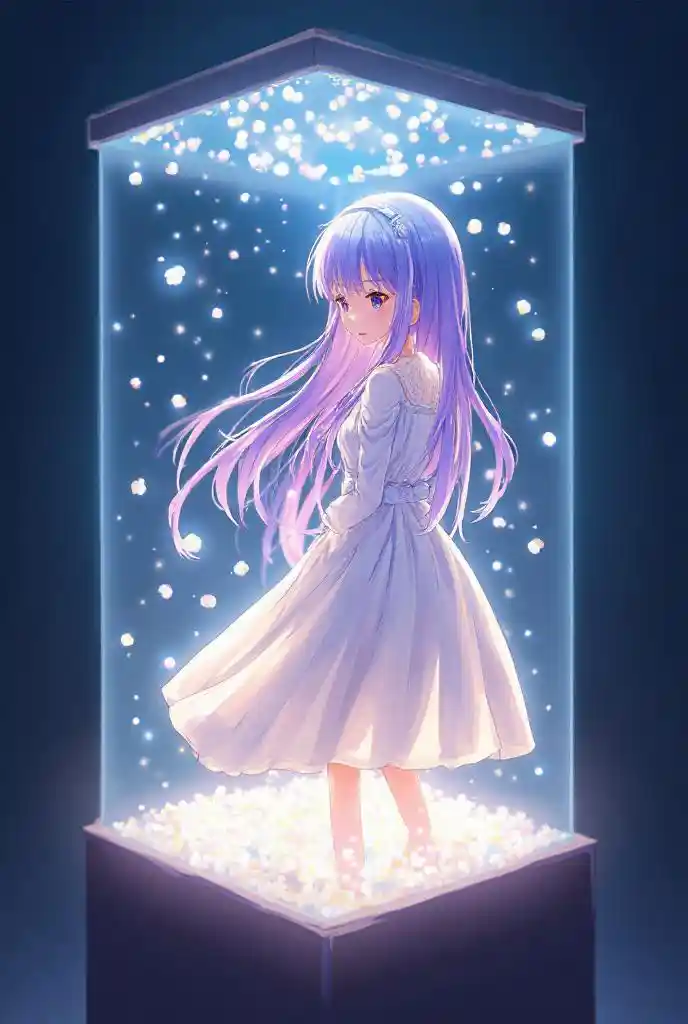 In einer Glasbox strahlte ein Mädchen mit langen violetten Haaren und einem langen weißen Kleid, und ein blendendes Licht erleuchtete die Umgebung.