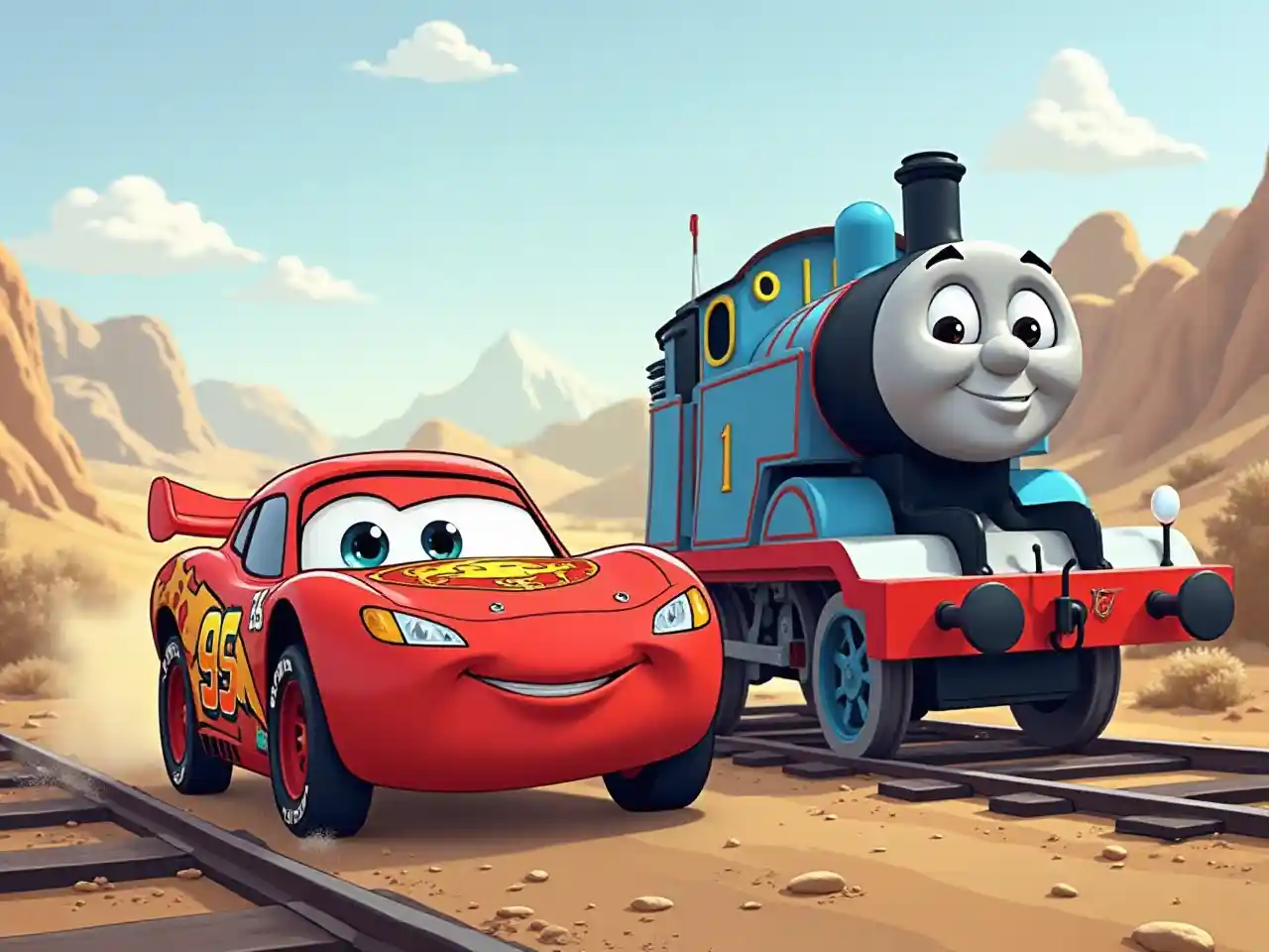 JoannaCartoon-Illustration von Lightning McQueen, der Seite an Seite mit dem Panzermotor Thomas auf einem Feldweg mit Bahngleisen wetteifert.