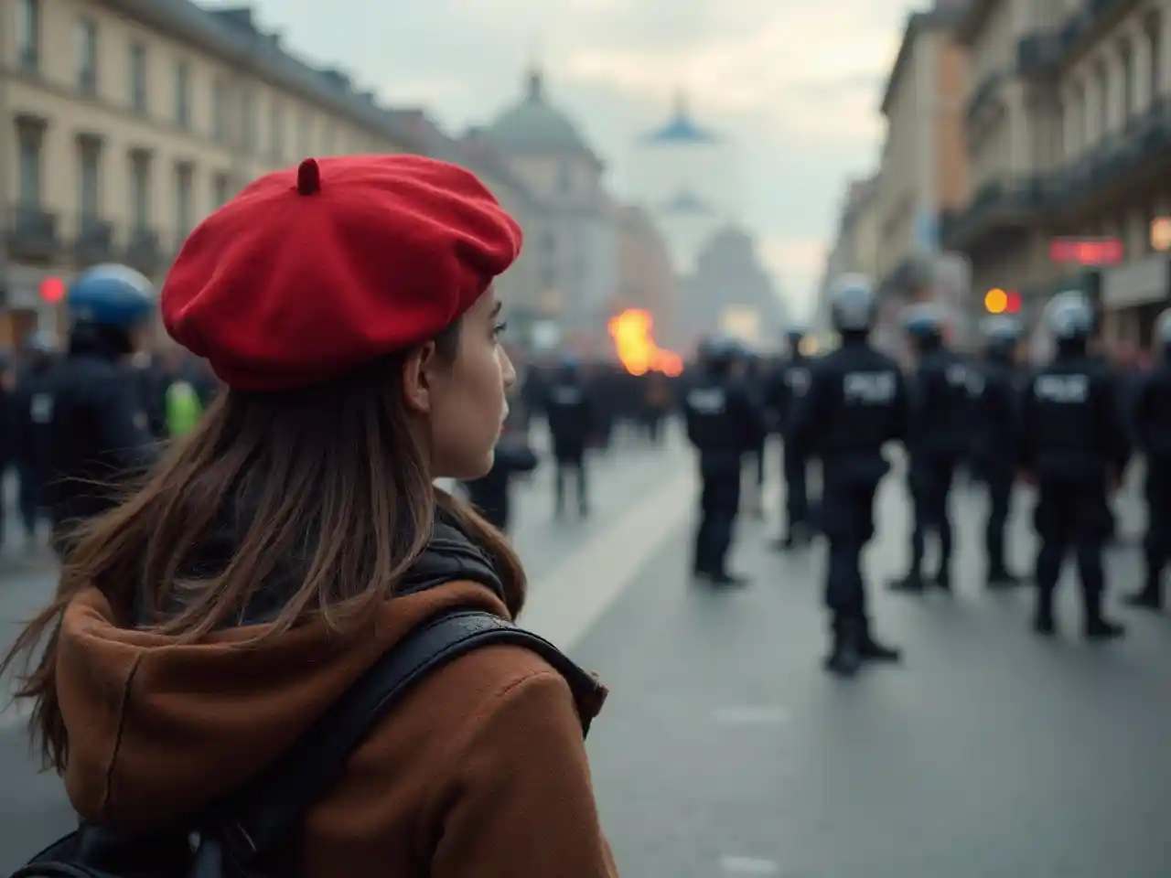 Mädchen mit roten Baskenmützen beobachten Straßenauseinandersetzungen zwischen Demonstranten und der Polizei in einer Stadt.