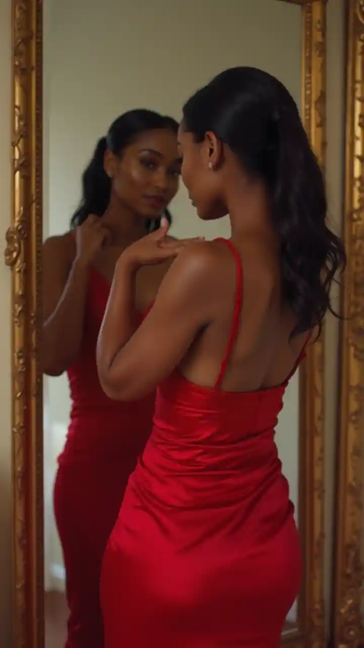 Stellen Sie sich eine Frau mit dunkelbrauner Hautfarbe vor, die einen roten Satin-Hosenträger trägt und ihren Körper an allen geeigneten Stellen umarmt. Sie steht vor einem riesigen, prächtigen Spiegel, ihre Augen sind fest verschlossen und ihr Gesichtsausdruck ist reine Zuversicht und Versuchung.