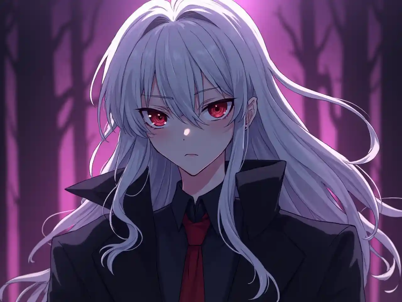 laaaaraMännlicher Vampir, rote Augen, Anime, Mystery, lange weiße Haare, lila Nebel
