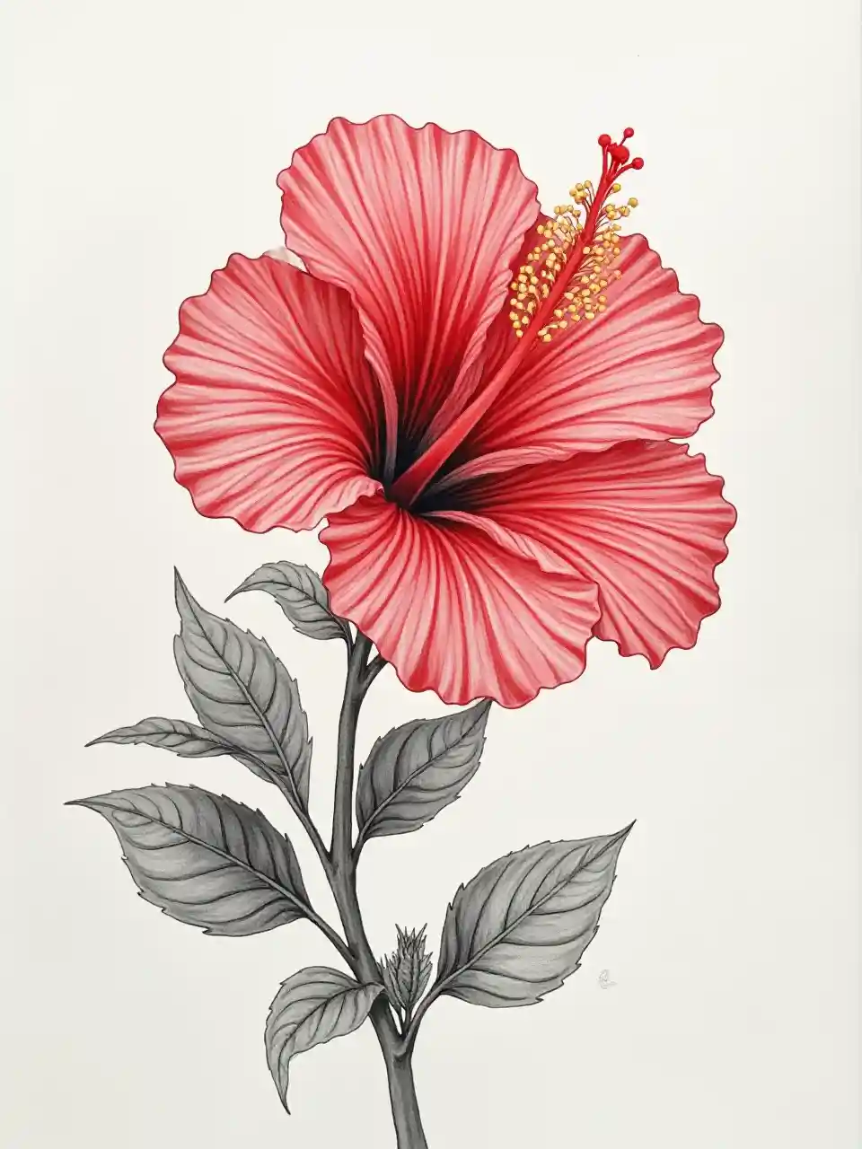 SawyerBleistiftzeichnung mit roter Hibiskuspflanze Einfarbige Färbung im Hintergrund