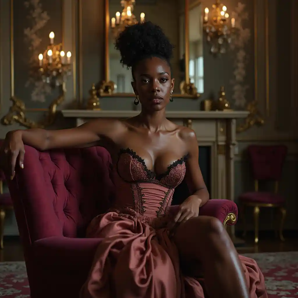 Eine 25-jährige Schwarze, die sich in einem Barocksalon auf eine Samtliege lehnt, verzaubert in einem hautengen, mit Spitze besetzten Kleid. Prachtvolle Spiegel und Kronleuchter umreißen ihre Körperhaltung, ihre verschränkten Beine und ihre hervorstehende Brust versprühen prächtigen Charme und verführerische Eleganz in einer extravaganten historischen Umgebung.