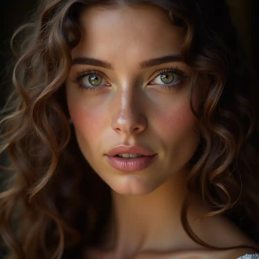 Ein atemberaubendes Detail (((Professional Photo)), eingefangen ein Paar (extrem weiche und glatte Haut), (extrem natürlich aussehende glänzende Augen) und ein fließendes langes Haar mit komplizierten Locken, die ihr Gesicht perfekt umreißen. Die Szene wird von (hellen Lichtern) beleuchtet, bringt ihre besten Gesichtszüge zum Vorschein und unterstreicht sie (ätherische Schönheit). Ihre Mimik strahlt Wärme und Charme aus, die perfekt symmetrischen, detailreichen Lippen passen zu ihrem perfekten Gesicht. Sie ist eine wahre Renaissance-Schönheit, makellose Hautfarbe und eine geschickte Liebe zum Detail, die dieses wahrlich unvergessliche visuelle Meisterwerk in Nahaufnahmen zum Leben erweckt