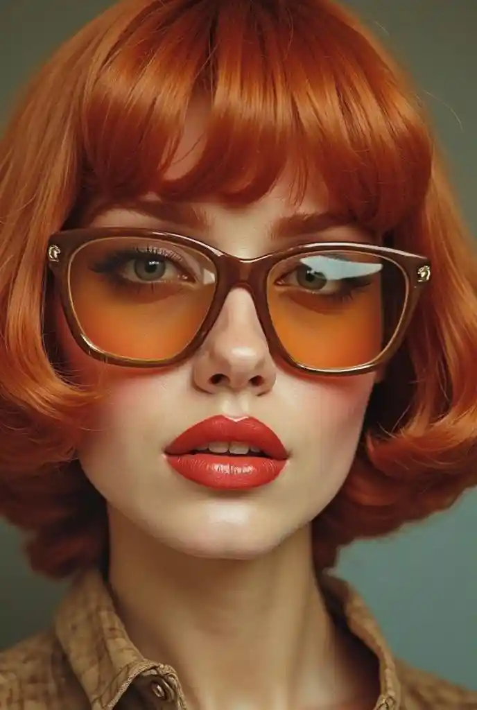 ((Stellen Sie sich vor, das Gesicht eines rothaarigen Models mit Haarpassagen auf dem Cover eines Modemagazins aus den 70er Jahren bezieht sich auf die Ära der großen Modebrillen.