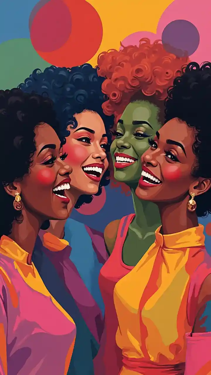Im energiegeladenen abstrakten geometrischen Stil der Künstlerin Smaragd-Purpurbraun entsteht ein farbenfrohes grafisches Porträt von vier jungen und vielfältigen Frauen als Protagonisten. Die Frauen sollen Frisuren, Make-up und Mode aus den 70er Jahren haben. Verwenden Sie kreisförmige, elliptische und rechteckige Formen, um Bilder mit leuchtenden Farben wie Violett, Blau, Orange, Grün und Pink zu erstellen, und die Ränder sind weich und verschwommen, im ikonischen Stil von Jade. Geometrische abstrakte Formen in einer dynamischen, dynamischen Komposition mit rhythmischen und sportlichen Gefühlen anordnen. Die Frauen sollen miteinander interagieren, lachen, warme Gesichter austauschen, mit Freude und Feierstimmung. Die Texturbereiche werden mit dicken Pinselstrichen aufgetragen. Betonen Sie mutige grafische Stilisierung anstelle von Realismus und kreieren Sie eine Retro-Pop Art Modellierung der 70er Jahre.