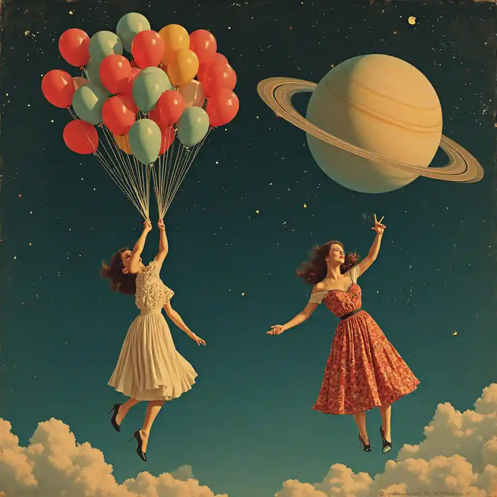 Retro-surreale Collagen, die zwei Frauen zeigen, die in der Mode der 1950er Jahre gestylt sind. Sie schweben zum Saturn. Jeder von ihnen hält zahlreiche bunte Luftballons in der Hand und hält sie in den Himmel. Im Hintergrund eine dunkle, hochkarätig besetzte Nacht, in der die Milchstraße deutlich erstrahlt. Der riesige Saturn zeichnet sich in der Ferne ab, seine Sternringe schimmern in dezenten Farbtönen. Die Szene ist skurril und traumhaft, und die reichen und lebendigen Farben kontrastieren mit dem dunklen und kosmischen Set und schaffen einen abenteuerlichen und Retro-Charme