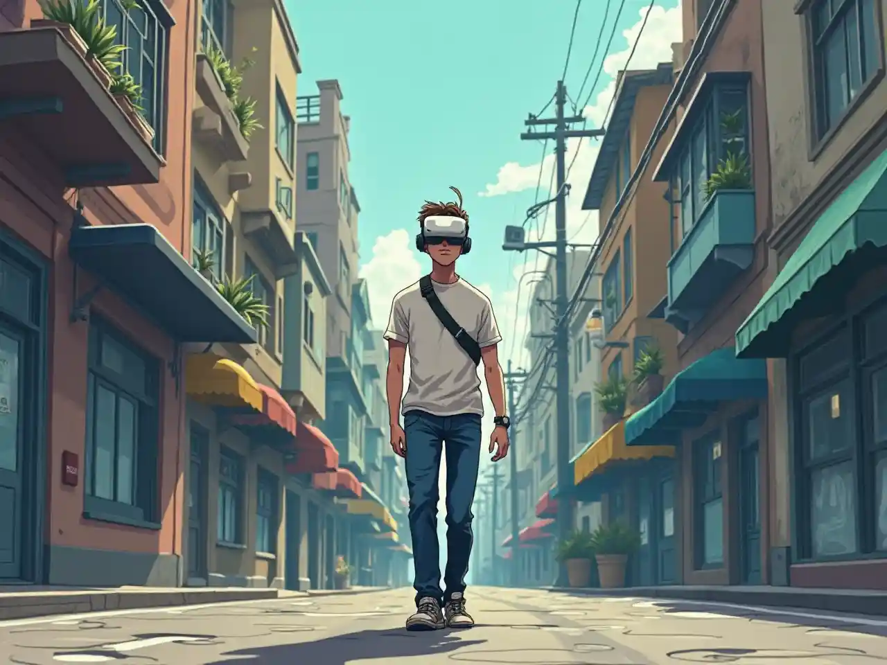 Anime-Style von Vintage 90. Ein einsamer Mann mit Virtual-Reality-Headset geht auf der Straße