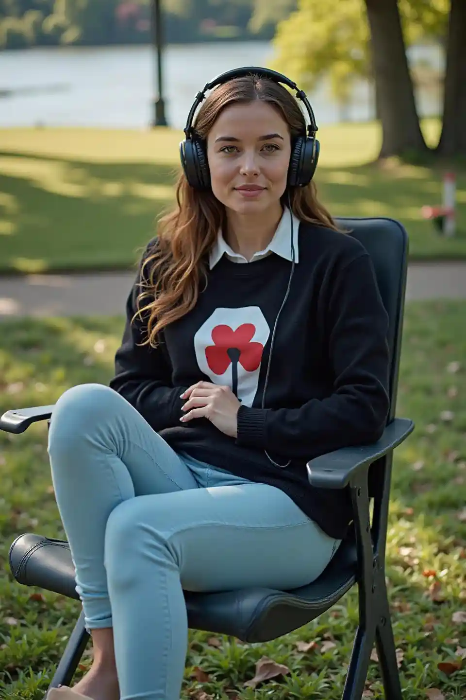 Eine Frau sitzt auf einem Parkstuhl am Fluss, trägt Kopfhörer, einen schwarzen Pullover, ein rotes Hemd mit weißem Hintergrund und trägt ein enges hellblaues P