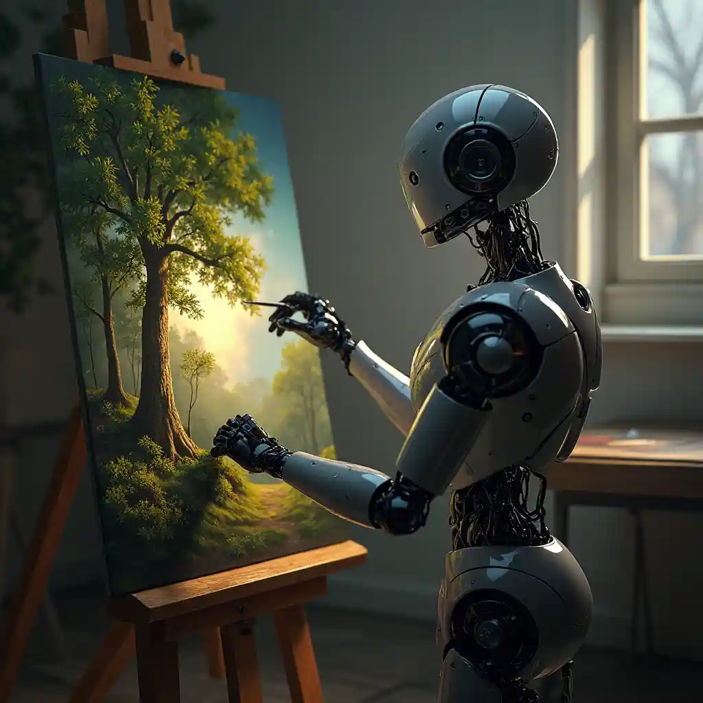 Eine realistische Illustration eines Roboters, der einen Baum auf eine Leinwand zeichnet, erscheint im Stil eines niederländischen Meisters in modernen Künstlerateliers, artStation, deviantart, cGSociety. Dramatische Lichter