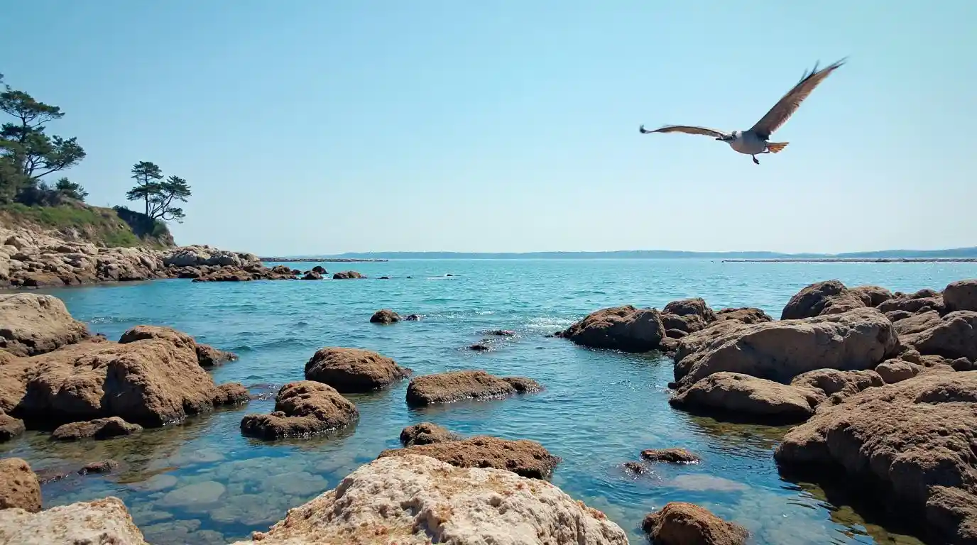 Die felsige Küste, das Gezeitenbecken ist voller Leben, Seevögel schweben am Himmel.