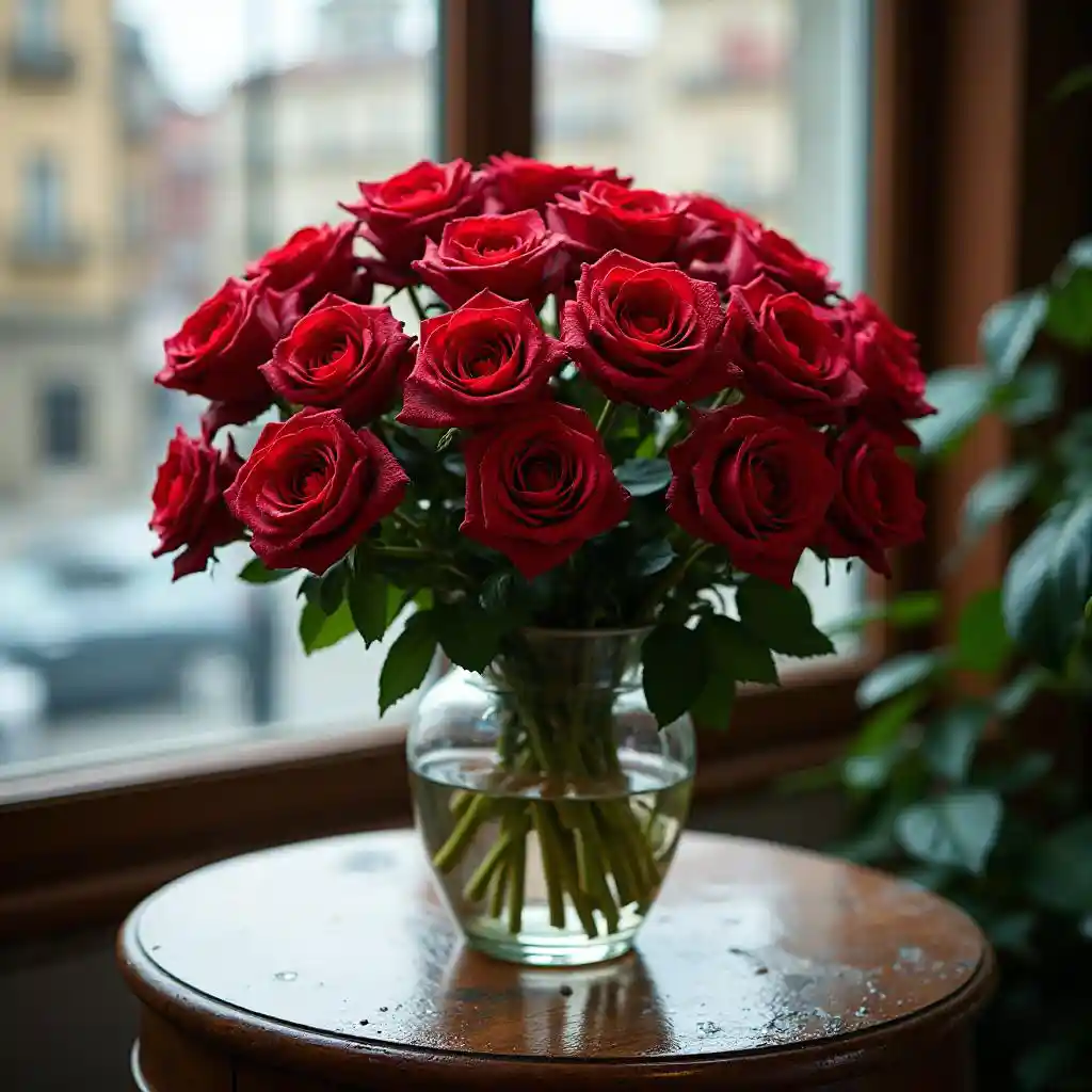 Ein Strauß roter Rosen in einer Glasvase. Auf einem antiken Tisch aus Rundholz. Hybridtee-Rosen - der Stolz des Vereinigten Königreichs. Die Wassertropfen fallen auf die Blüten. Die Stadt spiegelt sich in den Wassertropfen der Blumen. Üppig grüne Blätter. Sehr Nahaufnahme. Im Hintergrund ein Fenster. Größerer Realismus.