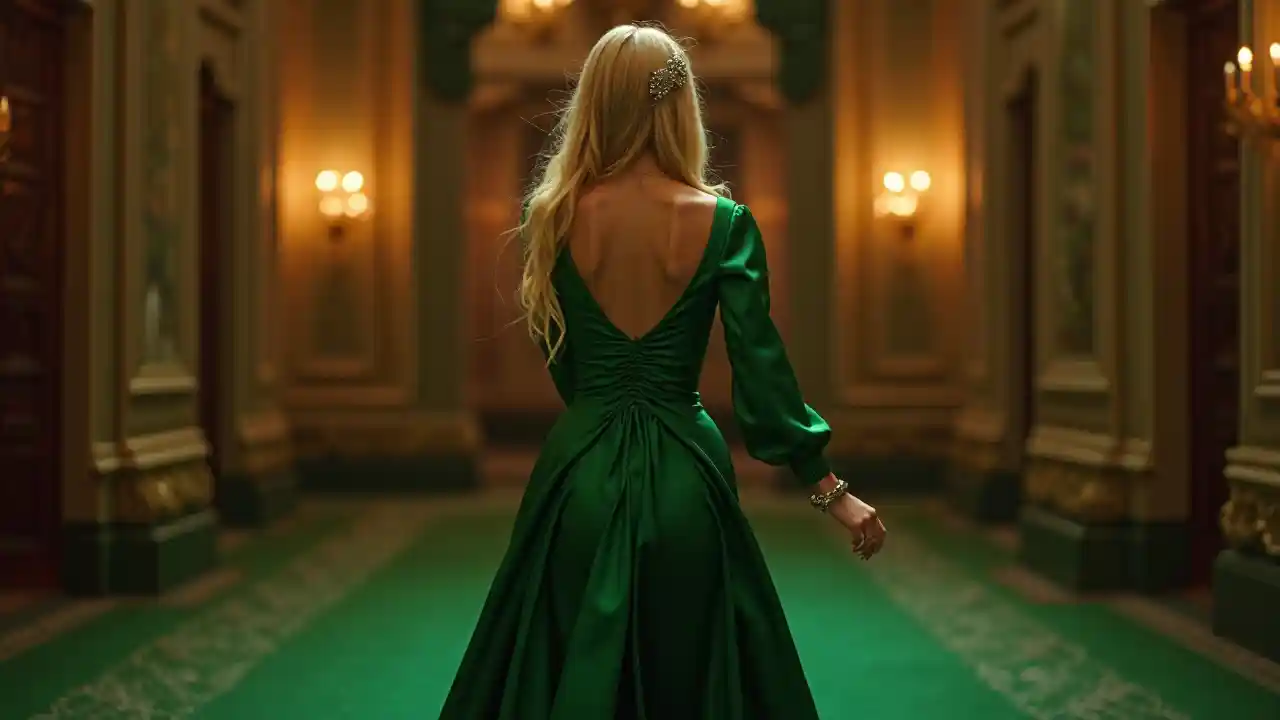 Ein edles, altmodisches royalgrünes Kleid für eine besonders schlanke Frau Anfang 20 mit europäischen Wurzeln und langen glatten Haaren, elegant kombiniert mit zarten Schmuckklammern. Das Kleid zeigt ein eng sitzendes Korsett, das ihre schlanke Figur unterstreicht, waghalsige Schnitte auf den Seiten und tief hängende Ausschnitte, die ihr Schlüsselbein und einen Hautschimmer geschmackvoll entblößen. Die eleganten Röcke sind auf dem Boden gestapelt und bestehen aus luxuriösen Stoffen, die bei jedem Schritt glänzen, während die strategisch angeordneten transparenten Paneele eine attraktive Kraft verleihen. Lange flauschige Ärmel, die am Handgelenk gestrafft werden, verstärken die dramatische Wirkung. Kombiniert mit auffälligen grünen Oberschenkelschuhen bringt sie Modernität in das klassische Design. Mit femininen Accessoires wie funkelnden Ohrringen und exquisiten Armbändern, die ihre Eleganz verstärken, wird das gesamte Ensemble perfektioniert. Diese bezaubernde Gestalt mit dem wunderschönen Opernhintergrund zu kontrastieren, die warmen und dramatischen Lichter erhellen, den Reichtum des Grüns hervorheben, ihre auffällige Präsenz hervorheben und alle, die sie anstarren, fasziniert und fasziniert machen.