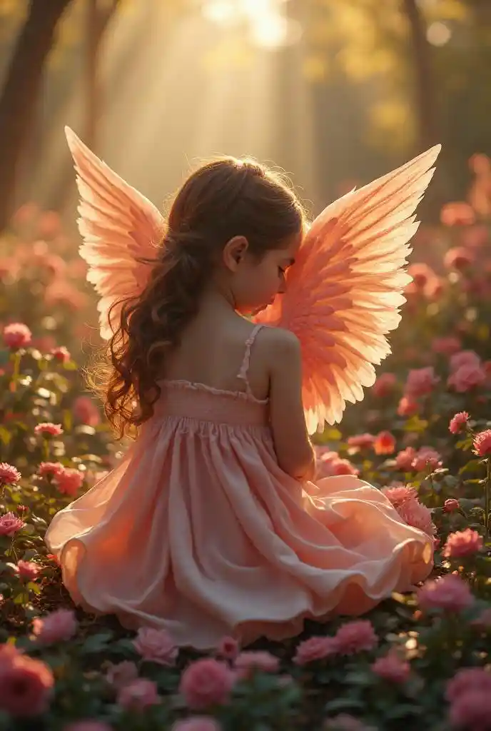 BentleySchöne Mädchen haben Flügel im heiligen Licht, gebrochene Blütenblätter glänzende Schatten, Engel zusammengerollt unter dem Schutz von Rosen, mit guter Beleuchtung