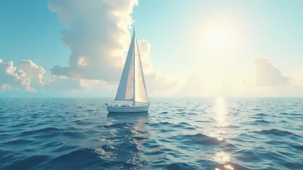BenjaminEin weißes Segelboot im Meer, sonnig, realistisch, hochdetailliert, Landschaft, Ultra HD, Konzeptkunst, Kontrastlicht, tiefe Farben, leuchtende Farben