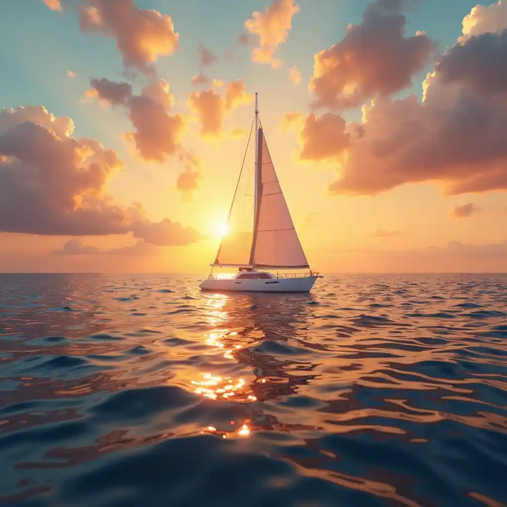 AvaEin weißes Segelboot im Meer, Sonnenuntergang, Realismus, hohe Details, Landschaft, Kontrastlicht, helle und gesättigte Farben