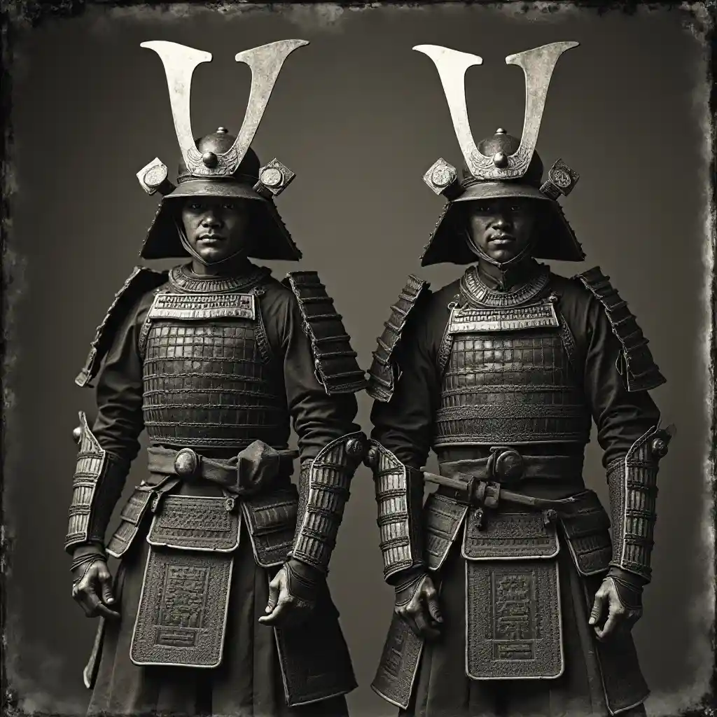 Zwei antike Samurai in prächtigen Rüstungen posierten feierlich und hielten ein einheitlich inszeniertes Porträt in einem auffälligen Schwarz-Weiß-Foto fest, das an Geschichte erinnert. Dieses Bild taucht in Retro-Töne ein und bringt eine moderne Wendung mit tiefem Indigo und funkelndem Silber, wodurch ein neuer Mosaikeffekt entsteht. Die Textur ähnelt den komplizierten Details der nassen Negative und fügt eine Schicht von Tiefe und Raffinesse hinzu. Diese Komposition verwebt geschickt avantgardistische politische Kommentare durch symbolische Elemente und schafft eine nachdenkliche und zum Nachdenken anregende visuelle Erzählung.